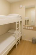 Oferecemos cabines de descanso climatizadas e automatizadas, cada uma dispondo de um beliche com duas camas de solteiro, tomadas, e espelho.